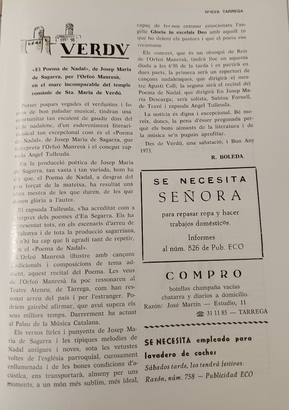 El Poema de Nadal a Verdú: publicació a la revista Nova Tàrrega, l'any 1973