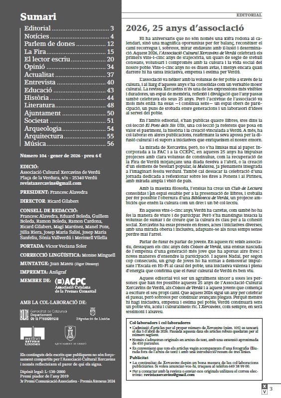 Aquest editorial vol ser un agraïment sincer a totes les persones que han fet possible aquests 25 anys de l’Associació Cultural Xercavins de Verdú, als Coixos de Verdú i a aquest jovent que comença a escriure el seu propi camí. Que aquest 2026 sigui un any per celebrar el passat, però sobretot per continuar avançant plegats. Perquè mentre hi hagi iniciativa, empenta i estima pel poble, Verdú continuarà sent un poble viu, actiu i culturalment ric. I Xercavins, com sempre, en serà